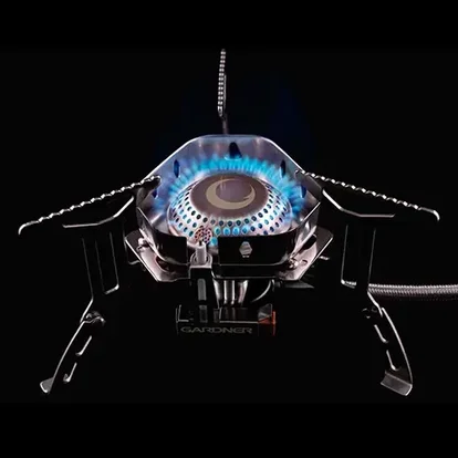 It has three 7/16″ threaded valve outlets available, that can be used individually, in pairs or all together. The two side outlets are perfect for use with the Gardner G-Force Stoves’ hoses. The top outlet can be connected with another device, such as another stove or a lantern if required.